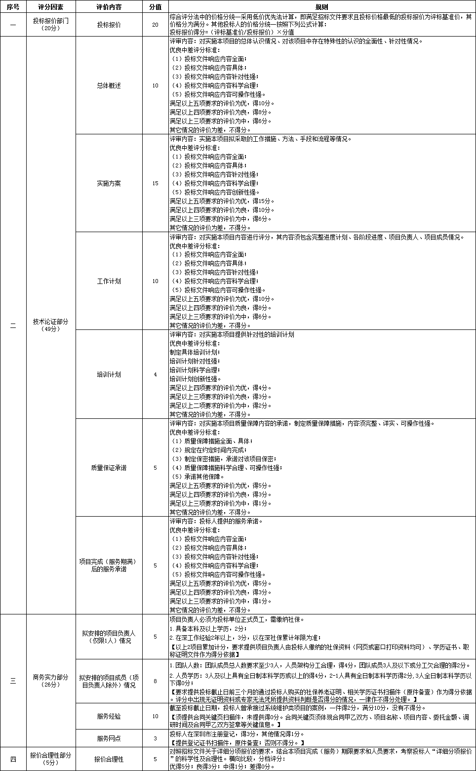 评审小组会按综合得分由高到低的顺序排出各有效投标的名次,得分最高的投标人为本项目中标人。评分指标如下: