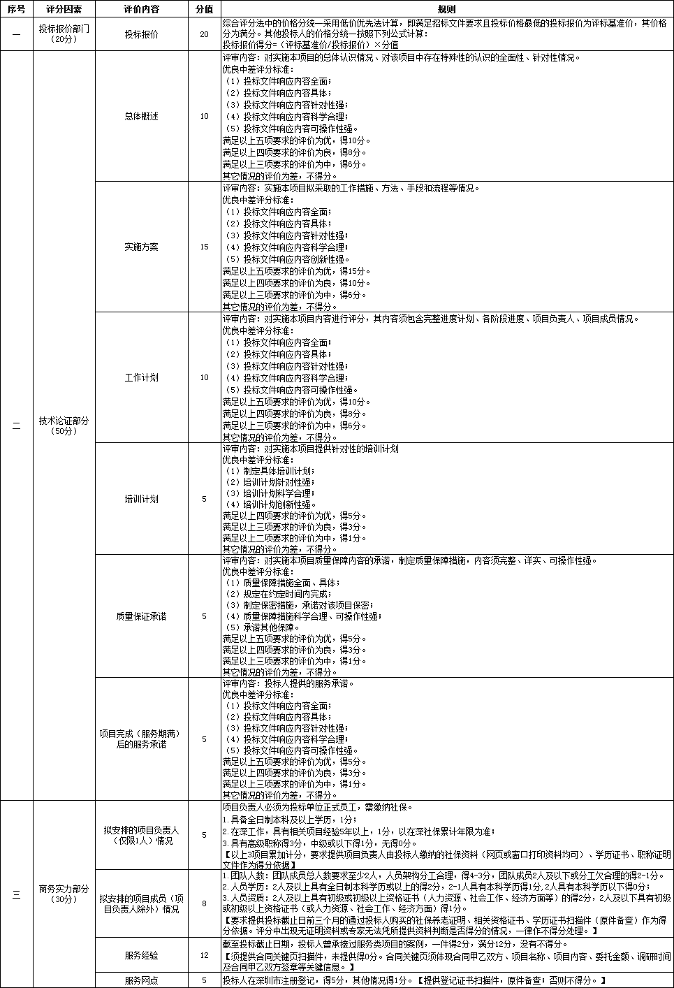评审小组会按综合得分由高到低的顺序排出各有效投标的名次,得分最高的投标人为本项目中标人。评分指标如下:
