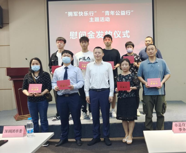 4月28日,深圳市社会捐助中心携手永道控股集团股份有限公司(以下简称“永道集团”)在深圳市团市委举行“拥军快乐行 青年公益行”主题活动,慰问戍边戎疆退役大学生士兵、退役军人志愿者。